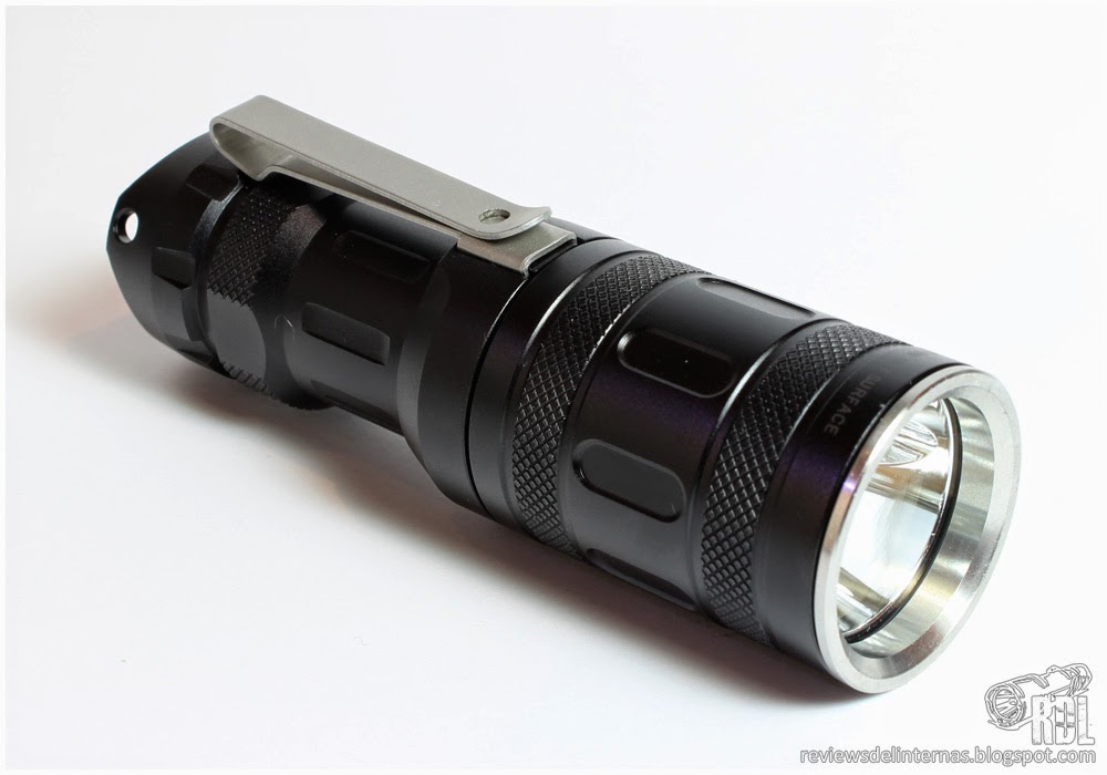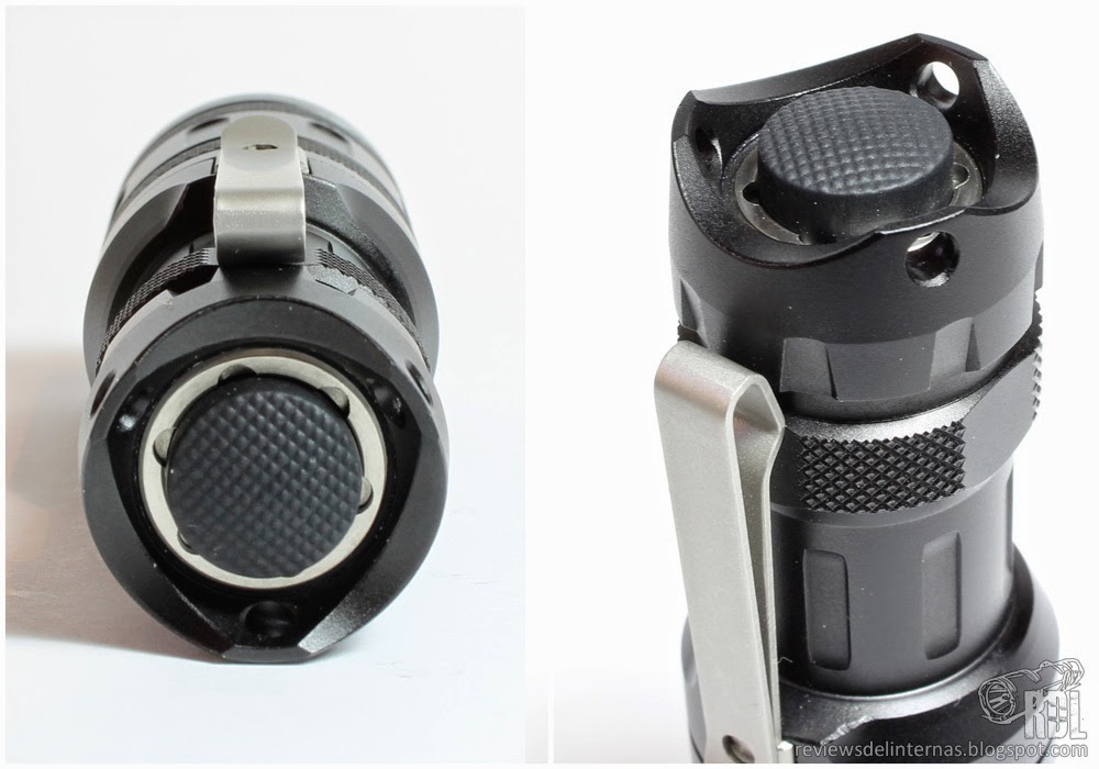 El diseño del clip permite fijar la linterna en ambas direcciones sin necesidad de invertir su posición. Tiene una tensión bastante bueno, y especialmente en su sección que nos permite fijar la linterna “boca abajo”. El clip parece estar construido en acero, con el típico baño de titanio y acabado arenado que otras Sunwayman como la M11R ofrecen.