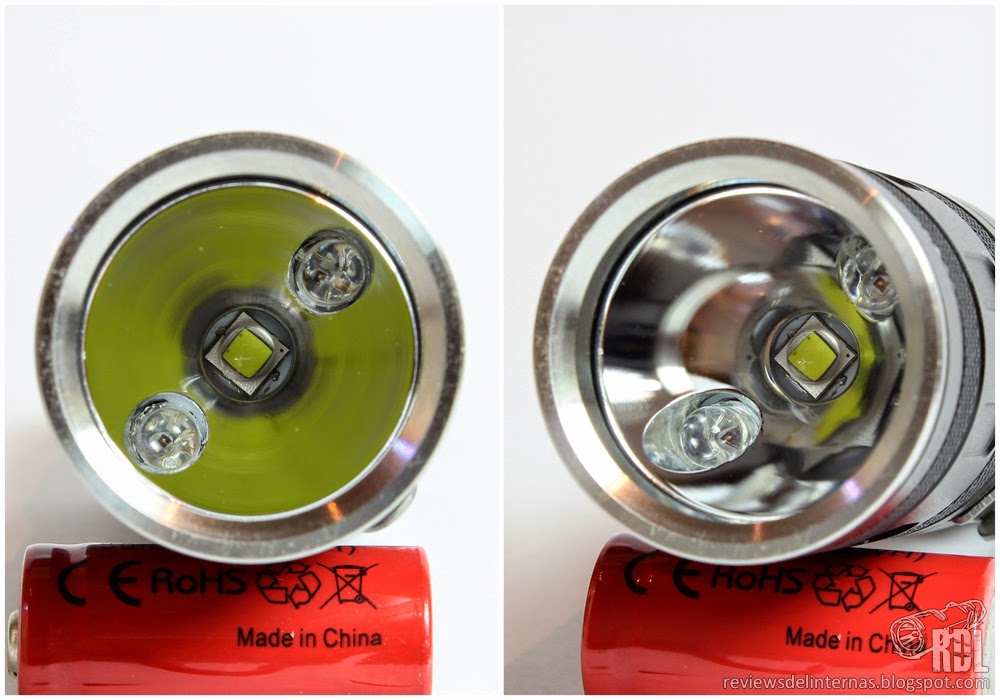La óptica cuenta con un reflector liso de dimensiones considerables en el que hay integrados dos pequeños LEDs de 5mm diametralmente opuestos, responsables de la iluminación en azul y rojo, y en el centro un XM-L2 (de bin desconocido).