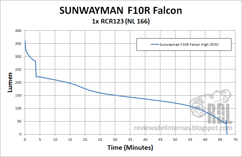 La F10R cuenta con un stepdown controlado por tiempo para su modo Turbo, que a los 3 minutos de uso continuo baja automáticamente un nivel y accede al modo High (modo no seleccionable mediante el interfaz de usuario) quedando su salida menguada en aproximadamente 220LM, prácticamente 100LM menos de lo que ofrece a los 30 segundos de su encendido. Me sorprende bastante ver como la salida parece en constante declive en su regulación para RCR, especialmente por la gran masa para disipar el calor con el que esta “pequeña” linterna cuenta.