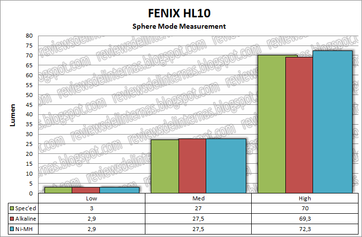 Los modos están muy bien espaciados, con 3LM de mínimo, 27LM para el modo medio y algo más de 70LM máximos. Como es de esperar, los datos coinciden armoniosamente con los obtenidos en la esfera integradora, una vez más demostrando lo acertados que estuvimos a la hora de la calibración del instrumento al utilizar exclusivamente linternas de esta marca, sin lugar a dudas la más fiable en cuanto a especificaciones.