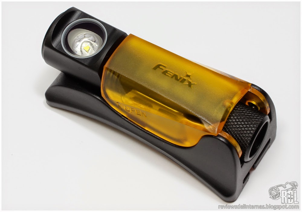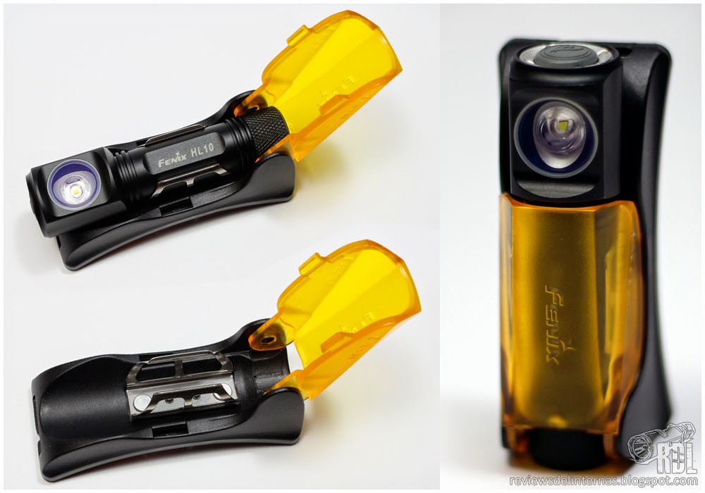 El soporte donde se monta el frontal es bien peculiar. Se trata de una pieza de plástico en la que, tras retirar su cubierta translucida de color anaranjado, encontramos una grapa metálica donde la linterna se instala para que quede correctamente orientada. Una vez dentro de su soporte, la linterna puede ser orientada en altura simplemente girándola desde el cabezal.