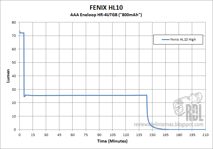 Como en la E99Ti, y otras linternas de la marca, este HL10 cuenta con stepdown controlado por tiempo, que baja al modo medio tras aproximadamente unos 5 minutos de uso continuo en su modo máximo, para evitar sobrecalentamiento (recordad que esta pequeña linterna trabaja aislada de la piel, por lo que nuestro cuerpo no absorbe su temperatura) y también para mejorar la eficiencia.