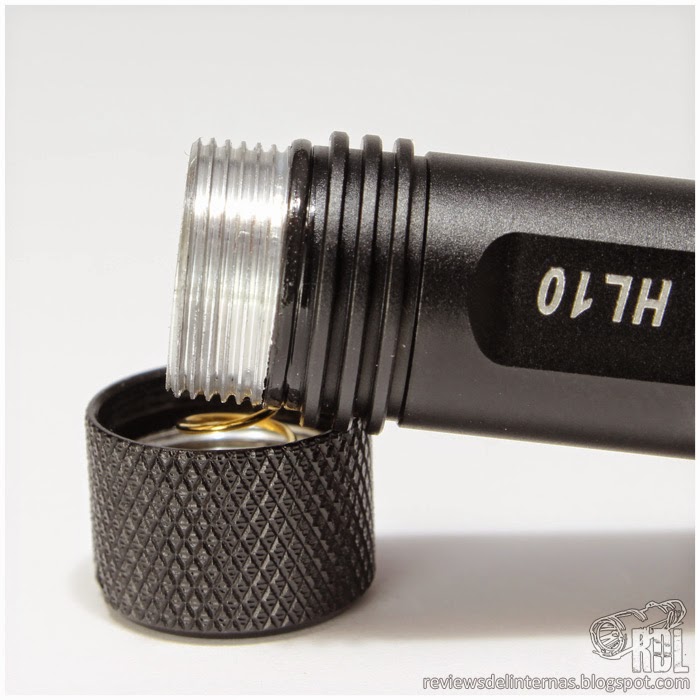 El tailcap cuenta con acabado en knurling, que facilita enormemente el desenroscado de la pieza para reemplazar la batería cómodamente. El diseño del tailcap permite su colocación en tailstand, por lo que este frontal puede ser utilizado como lámpara de trabajo manos libres sin problemas. Incluso encontramos una pequeña perforación en el borde por si deseásemos instalar una correa o una anilla y llevar la unidad en el llavero.