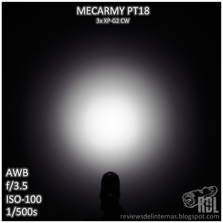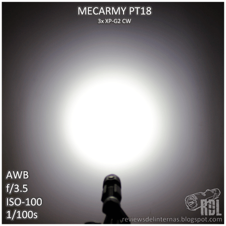Una de las características estrella de las lentes TIR es su superioridad a la hora de obtener un tinte uniforme. La PT18 no es una excepción y en su beam solo podremos identificar un único tono de luz, blanco frío sin las clásicas distorsiones que las linternas con reflector parabólico y emisores CREE de última generación producen, especialmente en la zona que rodea el hotspot.