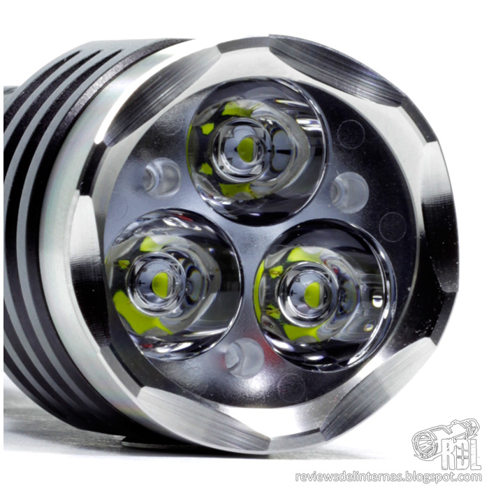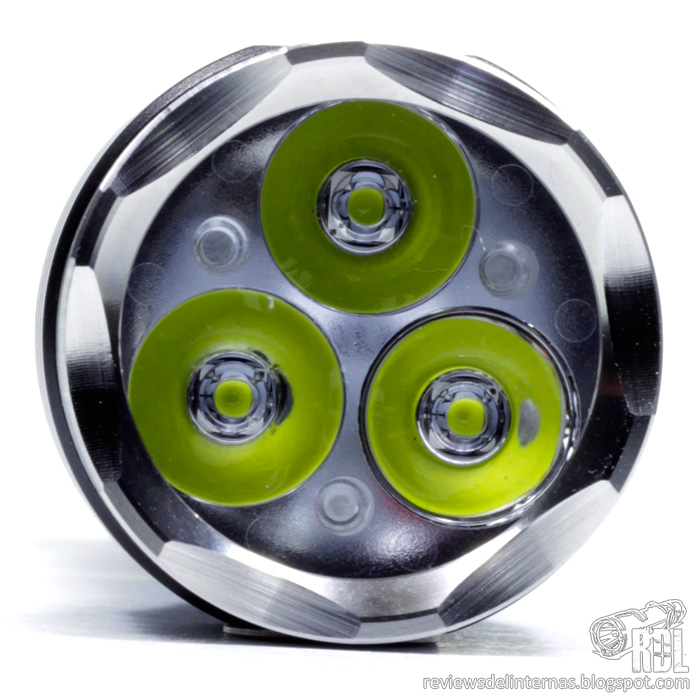 Cuenta con un bisel almenado en acero inoxidable, que sujeta en su sitio una lente TIR triple para tres emisores CREE XP-G2.