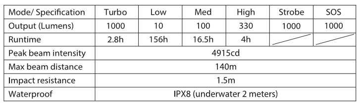- Memoria de modos: El encendido está fijado por defecto al modo Low, por lo que la linterna no tiene ningún tipo de modo de memoria.