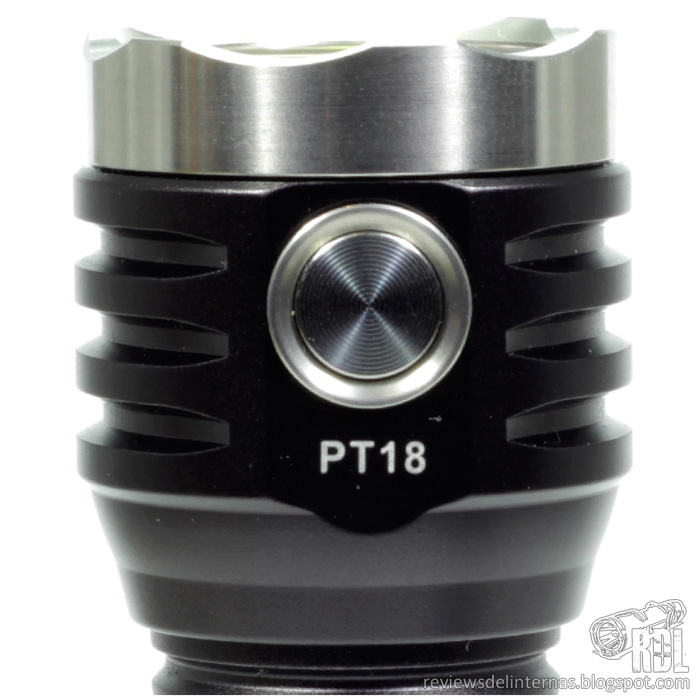 La cabeza está rodeada por discretas aletas disipadoras, con dos planos mecanizados diametralmente opuestos en los que en uno de ellos encontramos el switch, que está acabado en acero inox. a juego con el bisel.