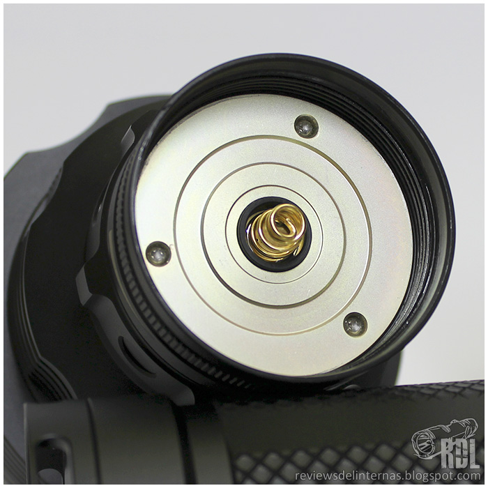 En su interior encontramos el contacto para el portabaterías, realizado mediante un robusto muelle con baño dorado, y un disco metálico que protege el acceso al circuito de la linterna.