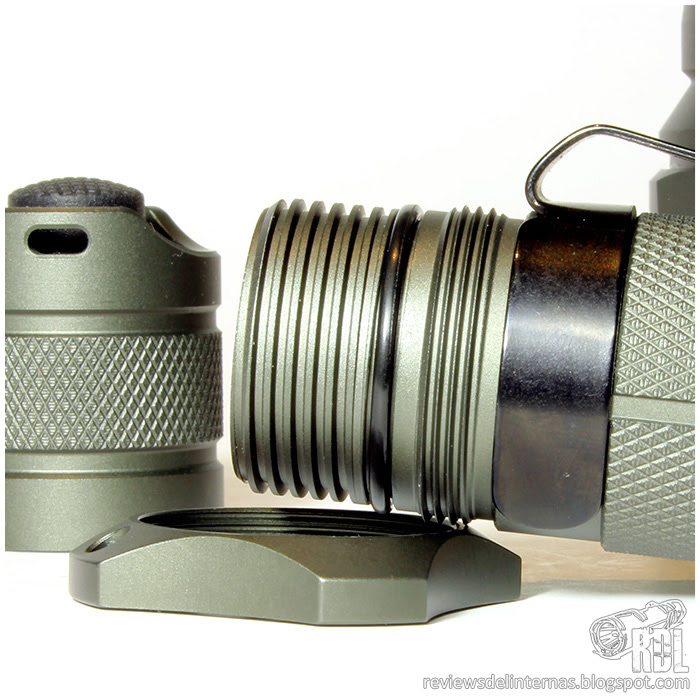 El diseño del tailcap, donde la linterna alberga su segundo interruptor, en este caso uno mecánico de tipo forward (también conocido como táctico), prioriza un acceso rápido al interruptor frente a la posibilidad de poder colocar la linterna en pié sobre su tapón de cola.