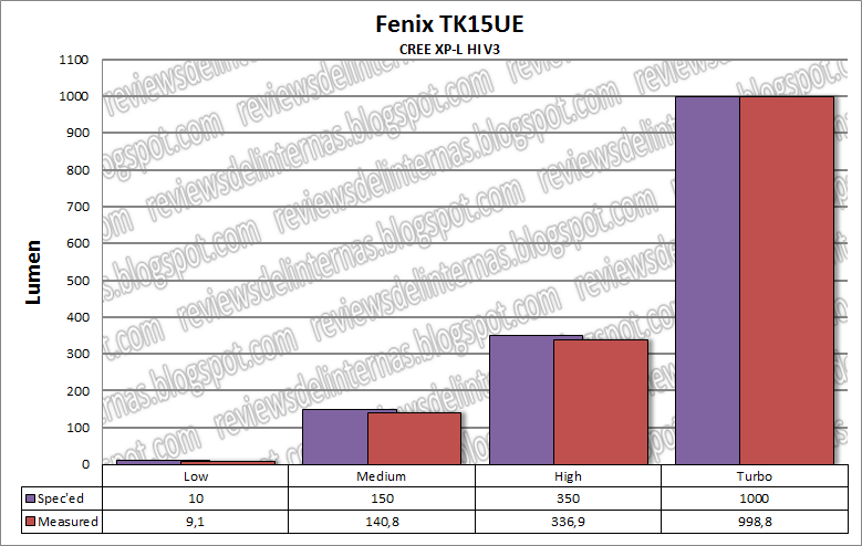Una vez más, podemos comprobar como todo el esfuerzo puesto en el calibrado de la esfera y el uso exclusivo de linternas de esta marca para la obtención de los valores de partida nos muestra una concordancia extrema entre lo que el fabricante especifica y lo que podemos medir por nosotros mismos. El reparto de modos es, a mi parecer, muy acertado.