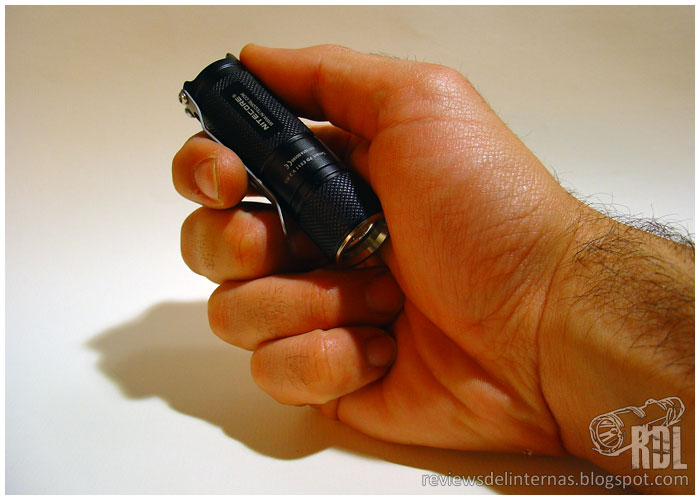 Lo primero que llama la atención es su extrema ligereza, y lo reducido de sus dimensiones. Con un diámetro de 21.8mm, una longitud total de 77mm y un peso aproximado de 45 gramos (sin batería) esta pequeña linterna tiene un tamaño perfecto para el uso al que está destinada.