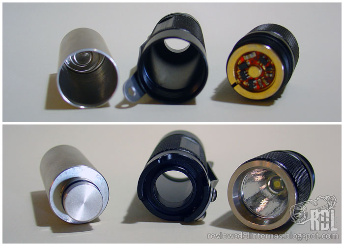 En la cabeza, encontramos el XP-G R5, perfectamente centrado tras un relativamente profundo reflector OP, todo ello protegido por una lente de cristal tratado antirreflejos. La lente va sujeta mediante una corona de acero inoxidable, otorgando mayor robustez en esta área particularmente propensa a sufrir daños o desgastes. Al otro lado, tenemos las roscas que vienen perfectas, completamente anodizadas y selladas gracias a una junta tórica. El circuito regulador queda expuesto en el interior, rodeado por una anilla con baño de oro, que es en realidad el interruptor digital que actuamos al pulsar el pistón.