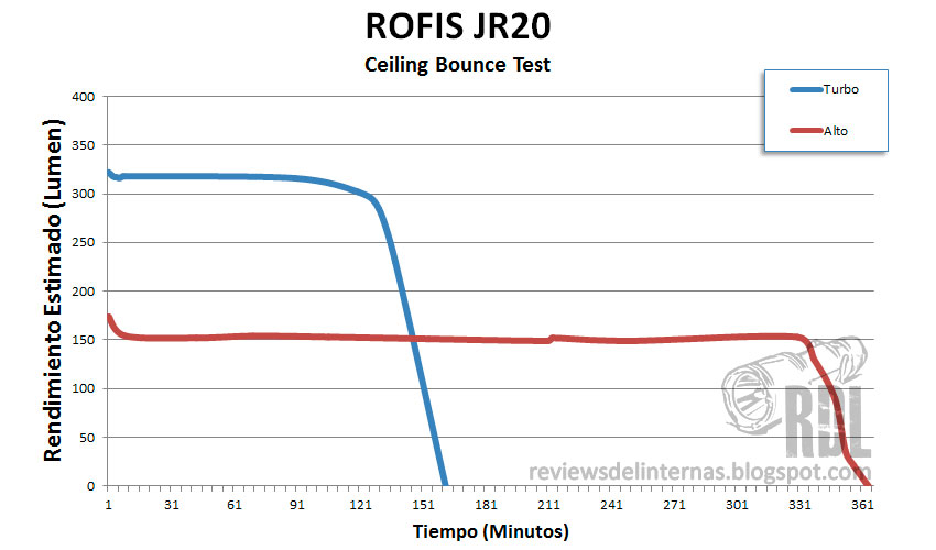 Podemos observar en la gráfica como la linterna está regulada, ofreciendo un rendimiento constante a lo largo de la vida útil de la batería. No hay ningún tipo de stepdown en el modo Turbo. El rendimiento en este Turbo es sencillamente espectacular.