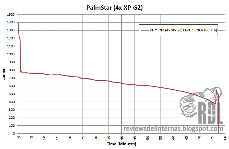 El nivel 5 cuenta con un stepdown controlado por temperatura, que monitoriza la temperatura interna y alcanzado una temperatura en concreto hace reducir el rendimiento un nivel para mantener a salvo la electrónica de sobrecalentamiento, además de ayudar a tener una eficiencia superior. La curva es bastante interesante, ya que contamos con unos primeros minutos con un rendimiento por encima de los 1200lm, que se estabilizan alrededor de los 750lm tras la entrada en acción del stepdown, y a partir de este punto la linterna parece mantener una regulación ligeramente decreciente, hasta el punto en el que parece que intenta subir de nuevo el nivel que ha bajado para posteriormente apagarse completamente.