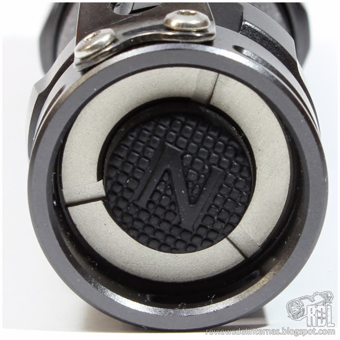 El tailcap contiene el conjunto del interruptor instalado mediante una pieza roscada de acabado arenado similar al del bisel, y cuenta con un recubrimiento de silicona para el pulsador ya visto en los anteriores modelos que emplean el mismo interruptor táctico.