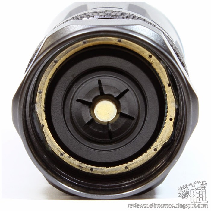 En el interior de la cabeza encontramos un mecanismo de protección contra la instalación de baterías con polaridad invertida, similar a escala al ya visto en otras Nitecore, prescindiendo de muelle en el contacto del polo positivo.