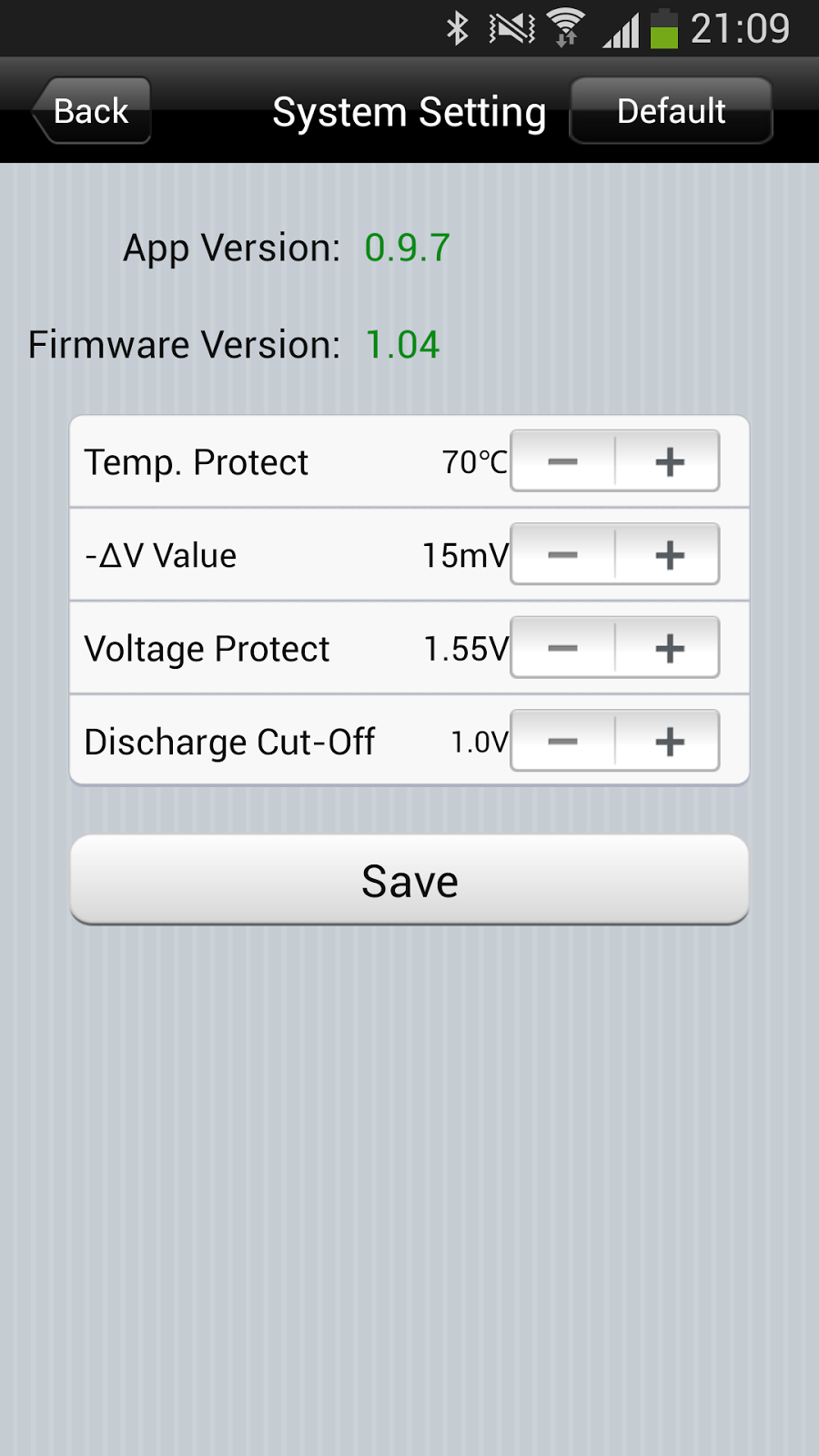 Además de mostrarnos la versión actual de la aplicación y del firmware del cargador, aquí podremos ajustar algunos de los valores interesantes, como la protección por temperatura (55ºC-70ºC), el delta V peak (15mV-3mV), la protección por sobrecarga (1.52V-OFF) y el voltaje final en descarga (0.5V-1.0V).