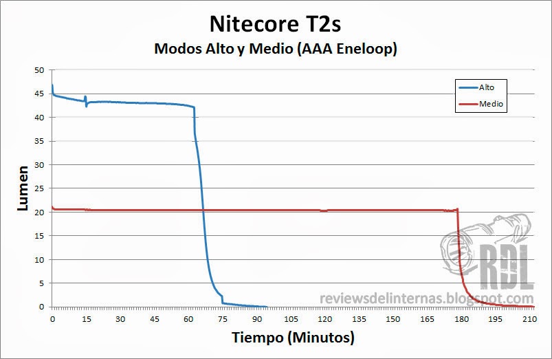Al no exprimir al máximo el LED, la Nitecore T2s consigue un buen equilibrio entre tiempo ininterrumpido de funcionamiento y rendimiento. Podemos ver como la salida está regulada y la linterna mantiene el brillo de forma más o menos constante durante su uso.
