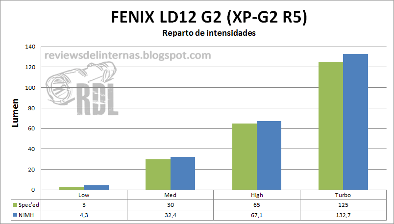 Vemos como la LD12 G2 no destaca ni por salida, pero si observamos como tiene un rendimiento más que aceptable con un buen compromiso entre regulación y salida. Una autentica lástima no poder comparar su rendimiento con el modelo anterior con XP-G de primera generación.