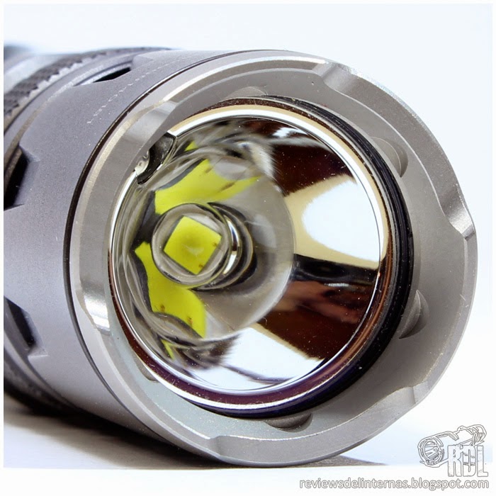 La linterna cuenta con un bisel en acero con acabado “arenado”, con tres discretas y nada afiladas almenas defensivas. La lente de cristal cuenta como es habitual con el tratamiento anti-reflejos, y el reflector es liso inmaculado con el XM-L2 correctamente centrado en su fondo, y un pequeño LED bicolor instalado en un orificio perimetral del reflector.