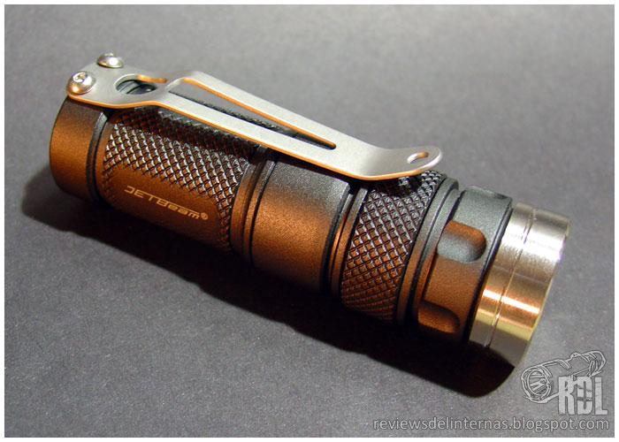 Exteriormente, además del ya mencionado clip de titanio, idéntico al encontrado como opción en la Nitecore EX11.2, llama la atención el empleo de una corona de acero inoxidable, que combina perfectamente con el tono grisáceo del anodizado HAIII del resto del cuerpo.