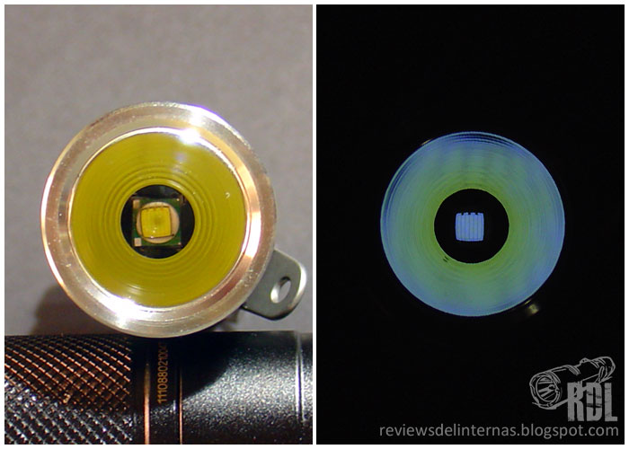 Al otro lado, además de la ya mencionada corona de acero inoxidable, tenemos la lente de vidrio templado con tratamiento antirreflejos, un reflector liso OP y el cree XM-L T6 perfectamente centrado. Ninguna de estas partes es desmontable, al menos fácilmente.