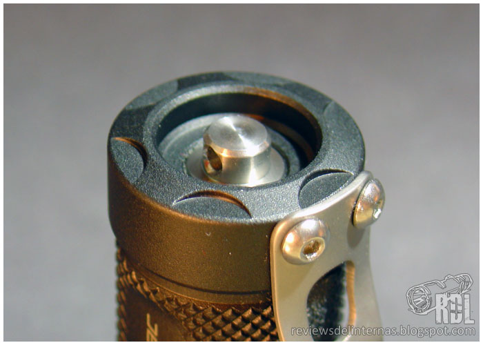 En el culo de la linterna, tenemos un pequeño enganche, también en acero inoxidable, para fijar la correa muñequera. Este sobresale unas décimas de milímetro del perfil de la linterna, pero no impide colocarla en “tailstand”.