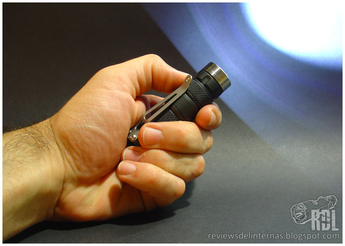 Lo primero que llama la atención al sostenerla entre los dedos, es lo pequeña y compacta que es. En apenas 80mm de longitud y 23mm de diámetro, y con un peso de 46.2g (con el clip instalado), tenemos una verdadera joya de linterna.