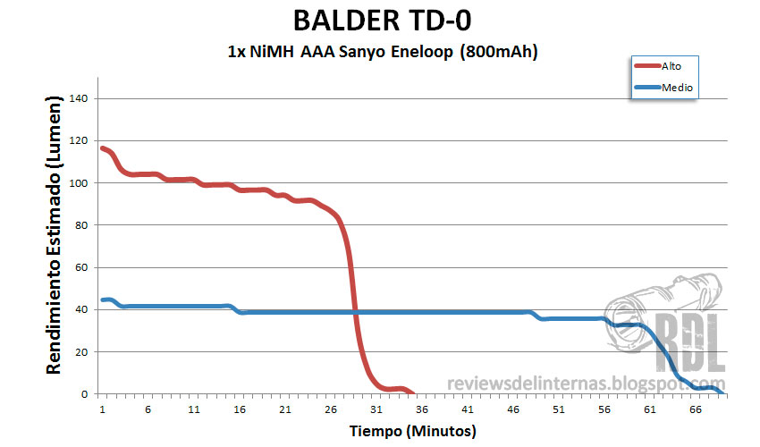 La gráfica enfrenta el rendimiento lumínico contra el tiempo, mostrando la curva típica de las linternas no reguladas. El brillo es dependiente del estado de la batería, mermando a medida que el voltaje va cayendo. Es mucho más acusado en el modo Alto, donde está sometida a una alta corriente de descarga. Aun así de los cerca de 30 minutos que ofrece este modo con una NiMH AAA, dispondremos de una potencia relativamente alta si la comparamos con otras linternas similares.