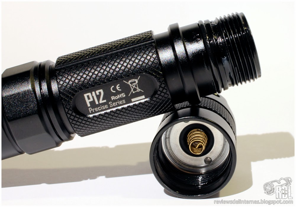 A continuación encontramos una zona ligeramente sobredimensionada con un acabado parcialmente hexagonal, que actúa como mecanismo anti-roll y evita que la linterna ruede al ser depositada sobre una superficie lisa. El driver está oculto bajo un protector mecánico contra la polaridad inversa, por lo que las baterías ideales para esta P12 serán las button-top.
