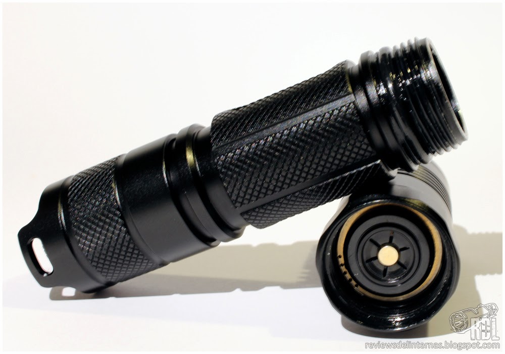 La pared del tubo cuenta con un grosor considerable, por lo que la linterna no tiene esa sensación de ser extremadamente endeble como ocurre con otras linternas similares. Exteriormente el tubo es muy similar al que encontramos en la Nitecore P25, con un acabado de knurling sobredimensionado, aunque nada agresivo, con varias pistas lisas que lo cruzan, y dos planos opuestos en los que se alojan los logotipos en un gravado a laser claro y definido.