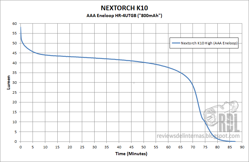Tras el habitual test de runtime en esfera integradora, con recargables obtengo un nada despreciable runtime de 70 minutos más o menos regulados, con unos 15 minutos extra en los que la linterna entra en una fase de caída progresiva antes de apagarse completamente. Recordad que las especificaciones a las que el fabricante hace mención incluyen otros tipos de baterías y también las tan aclamadas condiciones de laboratorio. Con una alcalina es posible superar los 100 minutos hasta que la salida caiga por debajo del 10%, a costa de tener una curva seguramente más prolongada.