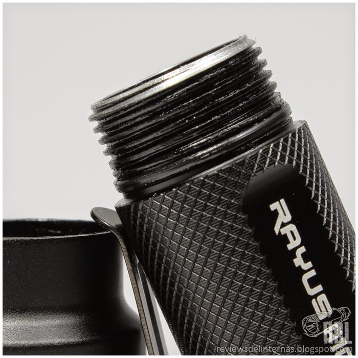 El tailcap de la linterna cuenta con dos almenas que rodean el interruptor principal, ambas perforadas para pasar por ellas la correa muñequera. Rayus a prescindido del clásico knurling en el tailcap, optando por unas pistas en sentido latitudinal, que aunque no resultan tan efectivas como la solución clásica facilitan el agarre de la pieza a la hora de desenroscarla para el cambio de baterías. El interruptor forward tiene un tacto excelente, con una activación momentánea a aproximadamente el 50% de su recorrido antes de llegar al click.