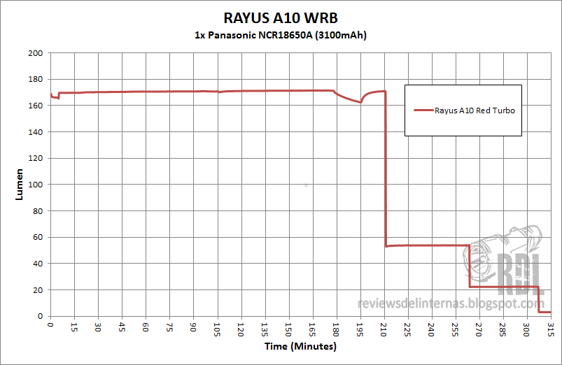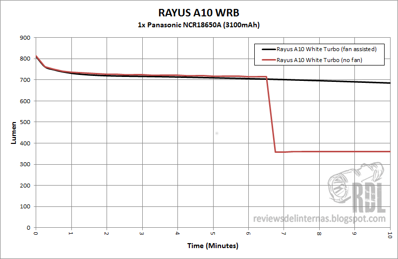La Rayus A10 ofrece una característica interesante, y es que al funcionar en el modo Turbo, en lugar de gestionar su rendimiento mediante un stepdown por tiempo, cuenta con un sensor de temperatura que baja un modo si esta sobrepasa un punto “critico”. Así pues, si las condiciones ambientales lo permiten, es capaz de funcionar en modo Turbo de forma ininterrumpida.