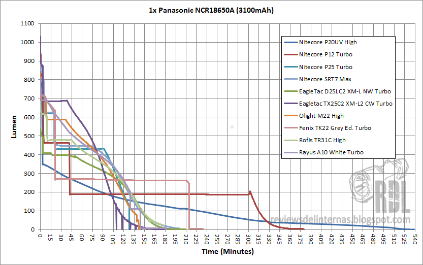 (Todas las mediciones están tomadas siguiendo el procedimiento ANSI NEMA FL1, tomando como valor el punto más alto de la lectura comprendida entre el segundo 30 y el 120 tras su encendido. Más detalles aquí.)