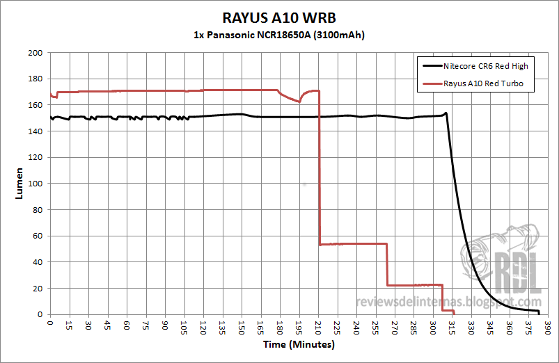 Frente a la Chameleon CR6 con la luz roja obtenermos una mayor salida durante toda la regulación, y evidentemente un runtime inferior.
