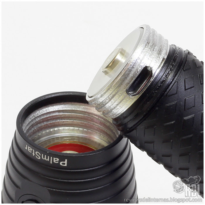 El espacio disponible para la batería es más bien justo, por lo que las baterías protegidas no entran por longitud. Tapón de cola carece de muelle, que ha sido sustituido por un pivote mecanizado directamente en el aluminio. El contacto positivo si cuenta con un muelle, por lo que las baterías pueden ser button top o flat top. El diseño del tailcap permite colocar la linterna de forma estable en modo vela.