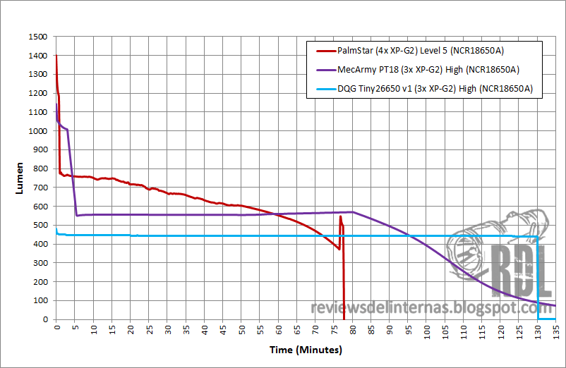 Si comparamos la curva con la de otras linternas similares, como podrían ser la MecArmy PT18 (con tres emisores XP-G2) o la ya descatalogada DQG Tiny26650 v1 (también con tres XP-G2) vemos como su regulación está en un punto intermedio, y también podemos apreciar como su runtime queda lejos del alcanzado por las otras dos, incluso contando la PalmStar con un emisor LED extra.