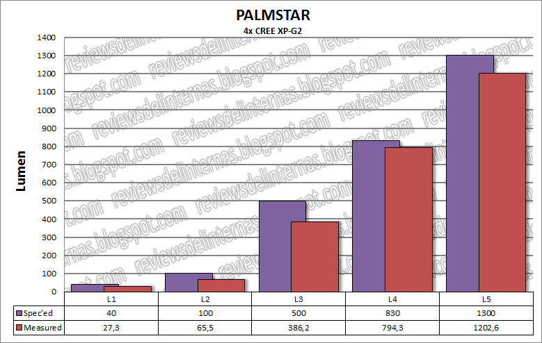 Aspectos negativos: Como acabo de mencionar, la baja eficiencia me ha dejado sorprendido ya que sobre el papel la configuración de esta PalmStar, con cuatro emisores y una salida máxima moderada, debería haber obtenido la mejor eficiencia calculada, no solo de las multi-emisor, sino por supuesto que las de un emisor sencillo, y como hemos visto esta linterna se queda bastante lejos. El interfaz de usuario, prácticamente idéntico al utilizado en la Niwalker MM25MB tiene el inconveniente de precisar la selección del modo en el primer segundo tras el encendido, requiriendo de un apagado-encendido para cambiar de modo si estamos ya utilizando la linterna. El reparto de modos, a mi parecer tiene un nivel que sobra (L4, "830lm") y necesita otro más bajo, algo en torno entre los 3~5 lm. El tinte es a mi parecer excesivamente frío. Aunque no soy de los que utilizan baterías protegidas, el espacio para alojar la 18650 es tan sumamente justo que incluso alguna no protegida con button top añadido entra algo forzada.