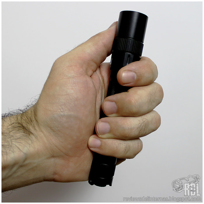 El anillo giratorio mediante el cual ajustamos el enfoque tiene un tacto ciertamente duro, lo que hace necesario el empleo de ambas manos para accionarlo: Una sujeta la linterna y la otra lo hace girar. Quizás con el uso y el tiempo la resistencia del anillo ceda y permita enfocar con la misma mano con la que se sujeta la linterna, pero recién sacada de la caja me resulta ciertamente imposible. El anillo no tiene un principio y un final, y si seguimos girándolo va sucesivamente pasando de una posición a la otra.