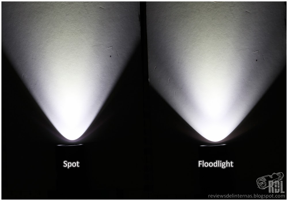 Como podéis advertir, la proyección en "floodlight" (con el reflector completamente retraído) es bastante más amplia que en "spot" (con el reflector completamente extendido). En "spot" el punto central queda realmente bien definido, un una corona algo amplia y con un peculiar aspecto ligeramente cuadradi. Los límites de la proyección, al contrario que en posición "floodlight" están bien definidos.