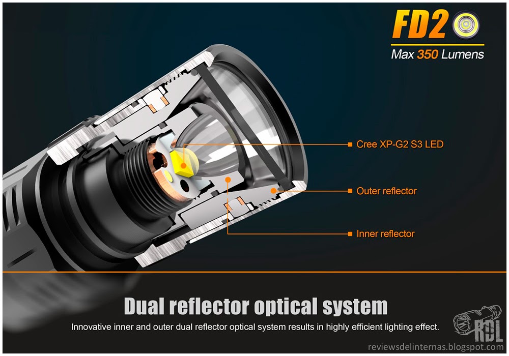 El aspecto de la óptica es limpio, con el LED perfectamente centrado. La lente de cristal tiene el típico tratamiento anti reflejos. Los dos reflectores son lisos y libres de cualquier imperfección.