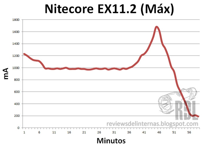 Como en todas las linternas con interruptores digitales, existe un consumo parasitario para mantener el circuito a la espera. Uno de las mejoras incluidas en esta versión 2, parece encontrarse en este aspecto. Transcurridos 30 segundos después del apagado, el sistema entra en inactividad, con un consumo en stand by de tan solo 0.08mA,por lo que la EX11.2 tardaría alrededor de 3 años en descargar por completo una cr123a de 1300mAh.