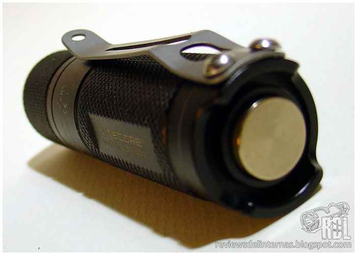 En el cuerpo, tenemos un knurling muy bueno, con un tacto áspero pero sin llegar a ser molesto, por lo que en mano da un agarre realmente bueno, sin llegar a tener esa sensación de tacto agresivo. Junto al pulsador, hay dos protuberancias que nos permiten colocar la linterna en tailstand, y cada una de estas protuberancias tiene una función dedicada. Mientras una tiene un rebaje interno para fijar la correa muñequera, la otra cuenta con dos pequeños taladros roscados que permiten colocar un clip opcional. Mencionar que la linterna se vende sin clip, y si queremos ponérselo tendremos que comprarlo por separado. En mi caso, como buen amante de los clips, lo pedí rápidamente junto a la linterna.