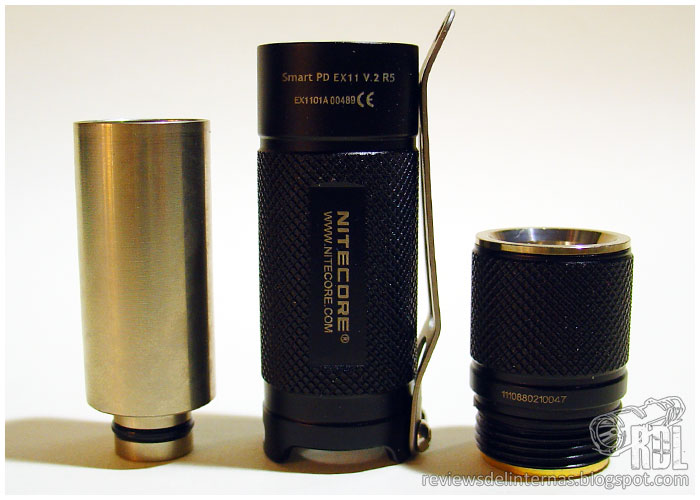Dentro del tubo, tenemos el sistema patentado por Nitecore “Smart Piston Drive”. Se trata de un pequeño pistón de aluminio, en el que la batería va alojada, y que actúa como pulsador. En el interior de este pistón, se encuentra un muelle para facilitar el contacto con el polo negativo