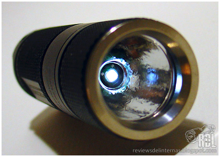 En la cabeza, encontramos el XP-G R5, perfectamente centrado tras un relativamente profundo reflector OP, todo ello protegido por una lente de cristal tratado antirreflejos. La lente va sujeta mediante una corona de acero inoxidable, otorgando mayor robustez en esta área particularmente propensa a sufrir daños o desgastes. Al otro lado, tenemos las roscas que vienen perfectas, completamente anodizadas y selladas gracias a una junta tórica. El circuito regulador queda expuesto en el interior, rodeado por una anilla con baño de oro, que es en realidad el interruptor digital que actuamos al pulsar el pistón.