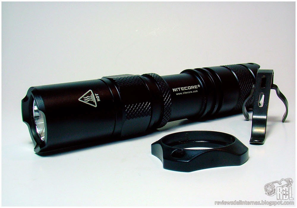 La linterna llega, al igual que todos los modelos actuales de la marca, en una caja de cartón impresa dentro de la cual encontramos la linterna acompañada de un buen surtido de accesorios y recambios, inluyendo un anillo táctico de plástico, un clip bañado en titanio, una correa muñequera, un juego de O-rings de repuesto, y un recubrimiento para el interruptor extra.