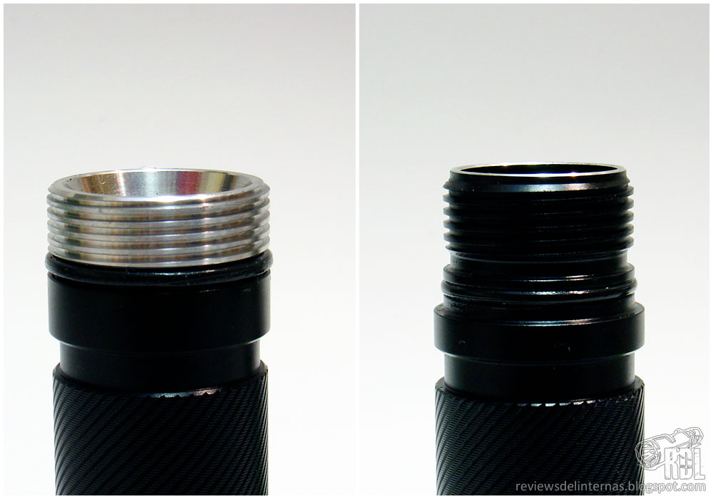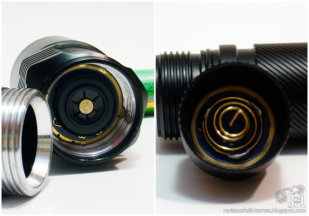 El haber escogido este tipo de combinación de roscas anodizadas/sin anodizar tiene una razón bien lógica: La unión del tailcap, siendo esta la puerta más habitual para cambiar la batería, está anodizada para resistir mejor la fricción en cada afloje y apriete. Además el anodizado es aislante eléctrico, por lo que también nos ofrecen la posibilidad de bloquear manualmente la linterna con solo aflojar el tapón media vuelta. Las roscas en aluminio crudo, situadas en la unión con cabeza, no deberían tener tanto uso habitual, y al haberlas dejado desnudas se mejora su conductividad eléctrica ya que la zona por la que la corriente ha de pasar es enorme y también mejora la transferencia térmica, en la zona más crítica de la linterna.