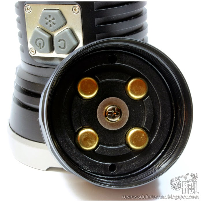 El alojamiento para las baterías está directamente mecanizado en el cuerpo de la linterna, prescindiendo del típico cartucho porta baterías. Encontramos unos grabados en el interior que nos indican la polaridad correcta. Al fondo del tubo divisamos el circuito con los cuatro resortes, junto a los cuales vemos también indicaciones sobre la polaridad de las baterías. Aunque la linterna está dotada de protección electrónica contra la polaridad invertida, hay que prestar especial atención ya que la disposición de las baterías (2S2P) y elementos de contacto no coinciden con lo que habitualmente encontramos en este tipo linternas de cuatro baterías (muelles-contactos).