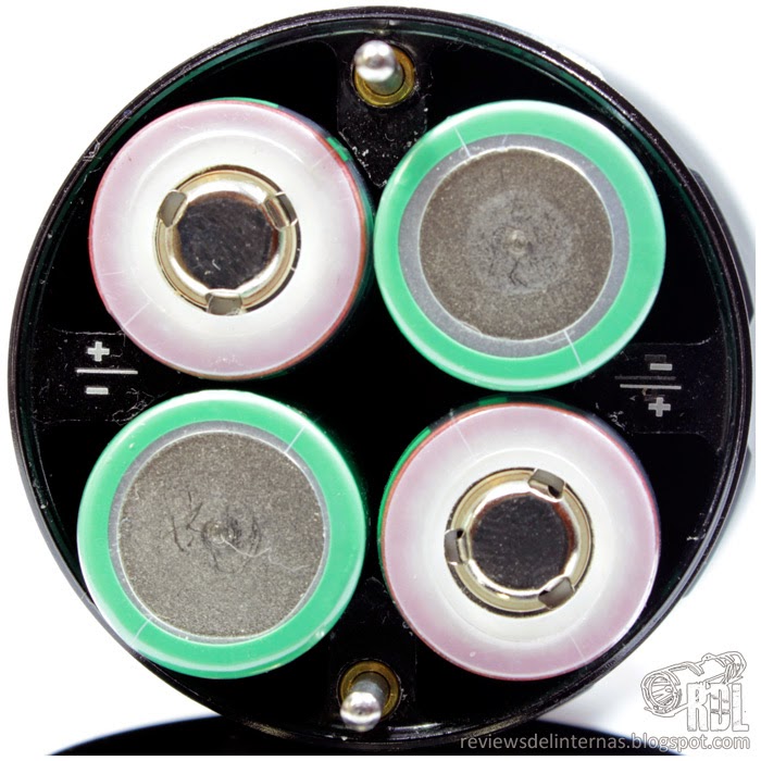 El alojamiento para las baterías está directamente mecanizado en el cuerpo de la linterna, prescindiendo del típico cartucho porta baterías. Encontramos unos grabados en el interior que nos indican la polaridad correcta. Al fondo del tubo divisamos el circuito con los cuatro resortes, junto a los cuales vemos también indicaciones sobre la polaridad de las baterías. Aunque la linterna está dotada de protección electrónica contra la polaridad invertida, hay que prestar especial atención ya que la disposición de las baterías (2S2P) y elementos de contacto no coinciden con lo que habitualmente encontramos en este tipo linternas de cuatro baterías (muelles-contactos).